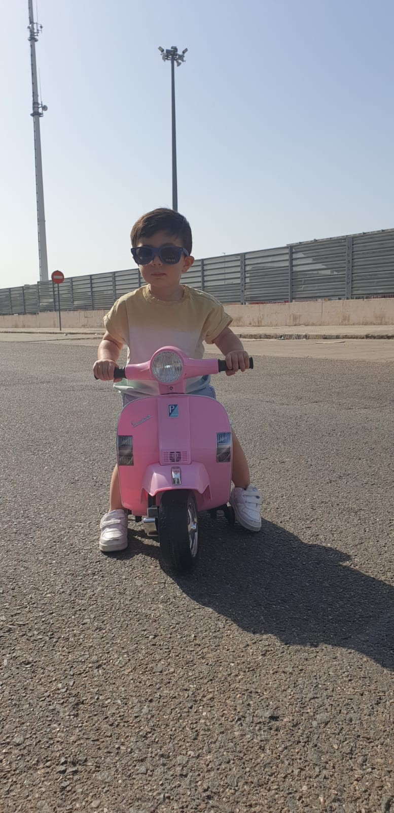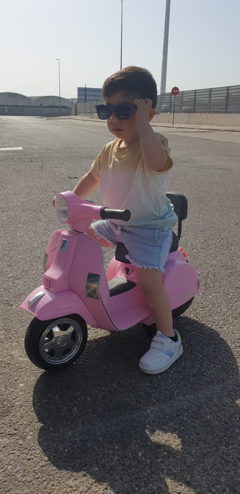 Moto tipo vespa para niños de pequeño tamaño, capaz de alcanzar un máximo de hasta 2-3km/h aproximadamente (incorpora botón de selección de velocidad alta o baja). Sistema de aceleración por pedal.